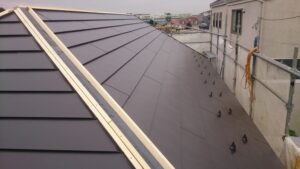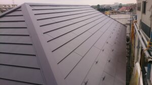 そのため、今回は耐震性向上につながる屋根の軽量化と将来のメンテナンス回数を減らせる高耐久仕様を重視し、弊社ブランドの「稜線横葺ハイブリット」をご提案しました。