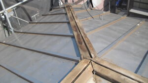 瓦棒葺きとは、瓦棒とよばれる細い木材を屋根の勾配に沿って横に並べ、その上から金属板かぶせて固定する屋根です。