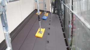 こちらに使用している防水シートは弊社独自のもので、従来のアスファルトルーフィングにポリマーなどを添加し、改良された改質アスファルトルーフィングのものになります。