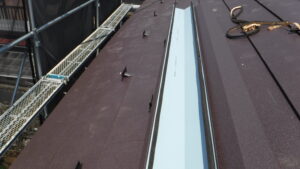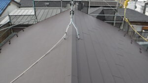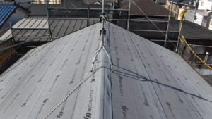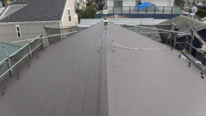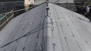 そのため、今回は耐震性向上につながる屋根の軽量化と将来のメンテナンス回数を減らせる高耐久仕様を重視し、弊社ブランドの「稜線横葺ハイブリット」をご提案しました。